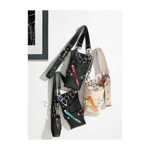 本革で大人の雰囲気漂う7丁差しのシザーケースはベルトで体格に合わせて調整可能、腰にも装着可能。