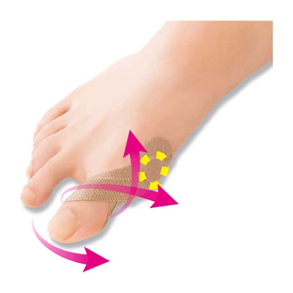 伸縮テープが親指を外側に引っ張り、外反母趾をサポート。