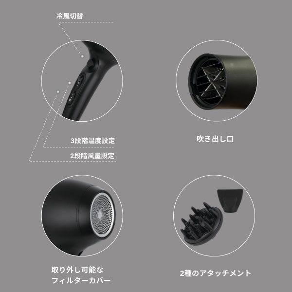また、シンプルな操作で温度と風量を個別に調整でき、施術や髪の状態に応じて温度は3段階、風量は2段階から選択可能。