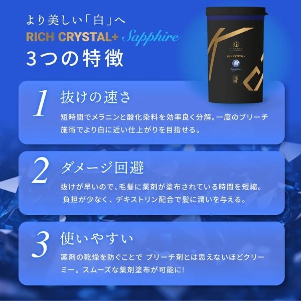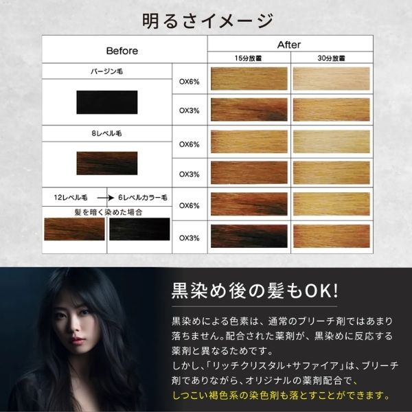 短時間でメラニンと酸化染料を効率良く分解。一度のブリーチ施術でより白に近い仕上がりを目指せる。